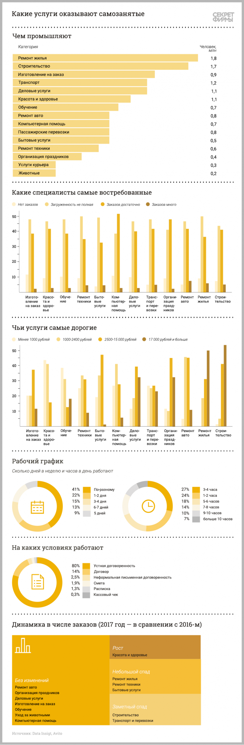 Чиновники боятся загадывать, сколько денег принесёт новый налог. Слишком мало известно о неформальном секторе экономики. Минфин считает, что самозанятых в России окажется 23 млн человек. У Росстата более скромные ожидания: 13,4 млн. О доходах этих людей точных данных нет тем более. Ниже представлены цифры из совместного исследования Avito и Data Insight. Они позволяют составить общее представление.