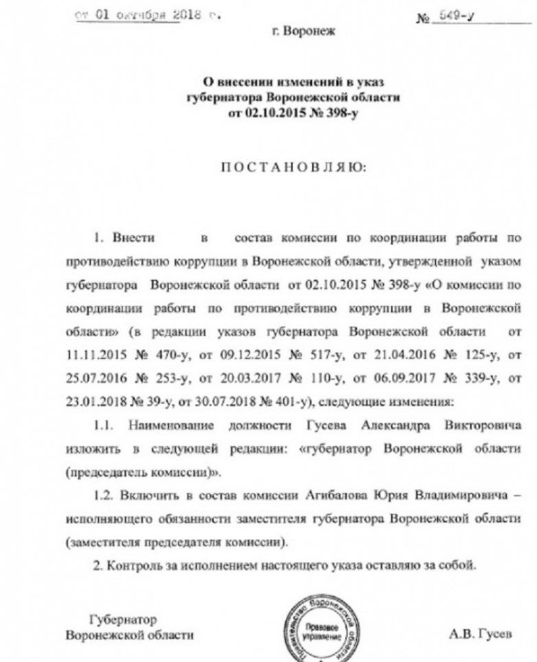 Чиновники объяснили нестыковку сроков тем, что Агибалов был назначен в комиссию автоматически, как действующий замгубернатора, а сам указ долго проходил согласование. И уже 2 октября на официальном портале регионального правительства Александр Гусев своим новым указом отменил предыдущее назначение.