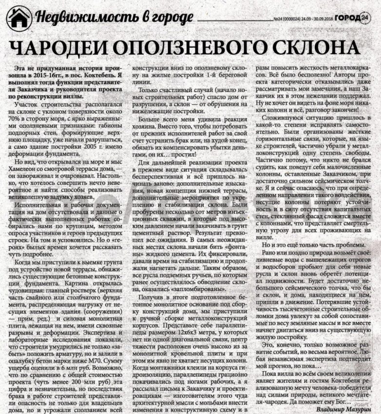 Поразившая воображение Мазурина вилла застыла на самом краю одного из оползнеопасных склонов Коктебеля и, как уверяет автор, действительно в любой момент может сорваться вниз. Неутешительный прогноз подкреплялся многочисленными деталями о недостаточном армировании оползневых грунтов и шатких сводах самого здания. А все потому, что «лишние» опоры могли испортить открывающийся взору морской пейзаж.