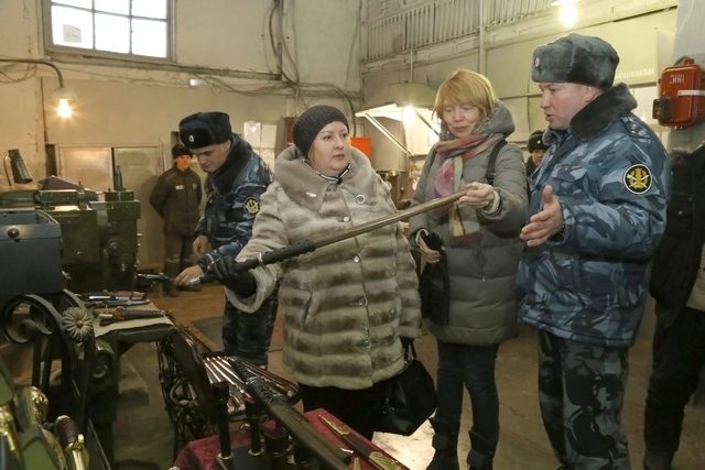 Члены омской ОНК рассматривают сувениры — сабли, изготовленные заключенными