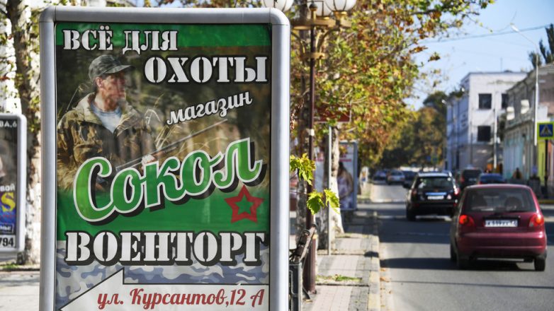 Вывеска оружейного магазина «Сокол» в Керчи, в котором, предположительно, купил патроны Владислав Росляков. Источник Лайфа в Росгвардии рассказал, что Росляков собрал все необходимые медицинские справки, прошёл курс безопасного обращения с оружием.