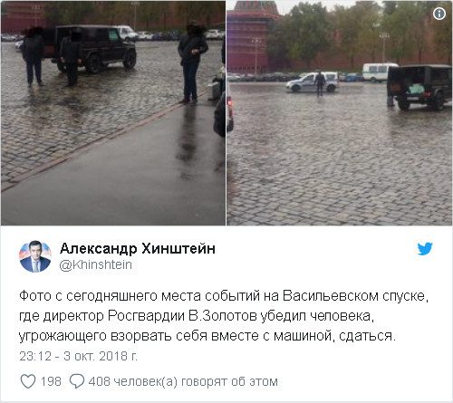 Хинштейн также опубликовал в микроблоге фото с места событий, «где директор Росгвардии В.Золотов убедил человека, угрожающего взорвать себя вместе с машиной, сдаться». Однако самого генерала на снимке не наблюдается.