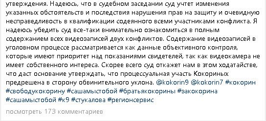 Адвокат Кокориных надеется убедить суд «внимательно ознакомиться с полным содержанием» видео конфликта с участием подзащитного и его коллеги — футболиста «Краснодара» Павла Мамаева. При этом Стукалова не исключает, что суд может отказать стороне защиты в ходатайстве. Это, по ее мнению, «даст основание утверждать, что процессуальная участь Кокориных предрешена в сторону обвинительного уклона».