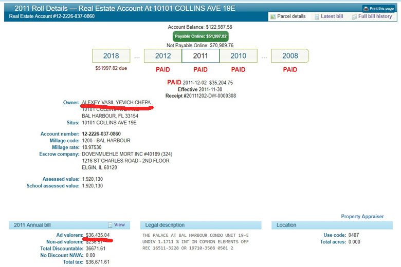 Учитывая, что годовой налог на недвижимость размером в несколько десятков тысяч долларов Чепа исправно платит, что опять же подтверждается документами, то нет причин сомневаться, что и проценты по кредиту так же погашаются вовремя и в полном объеме. Да и во всех остальных выписках в качестве владельца указан именно он — Alexey Vasil Yevich Chepa.