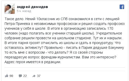 Ученику из Санкт-Петербурга, создавшему профсоюз школьников, грозят отчислением и прокуратурой