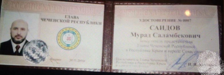 Официальное удостоверение Мурада Саидова, подписанное постпредом ЧР в Крыму Исой Хачукаевым, в котором указано, что Саидов — заместитель постпреда не только в Крыму, но и в Севастополе.