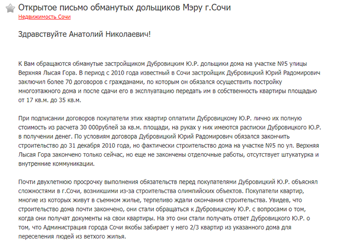 Письмо обманутых дольщиков многоэтажного дома № 5 по ул. Верхняя Лысая Гора в Сочи
