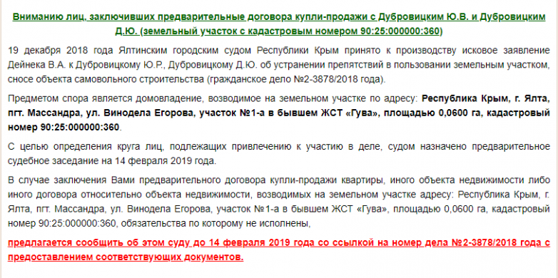 Ялтинский суд обратился к потерпевшим от махинаций застройщика Дубровицкого