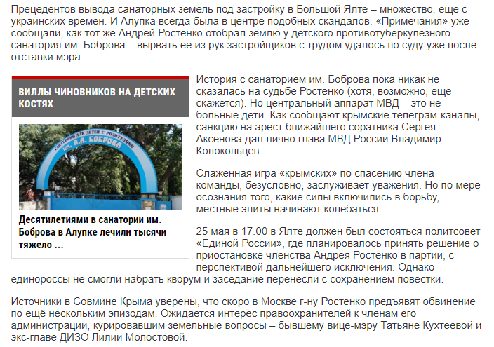 От источников стало известно, что в 2017 году глава Крыма уличил своего подельника в «крысятничестве»: тот перестал делиться по-честному и львиную долю от «дерибана» ялтинской земли стал класть в свой карман. Аксенов обиделся — уволил Ростенко с должности мэра Ялты и сразу же перестраховался, инициировав принятие постановления о моратории на любые операции с землей, недвижимостью и стройкой в Ялте, кроме случаев особого согласования с Советом министров Крыма, возглавляемым им самим. То есть таким образом Сергей Аксенов дал понять ялтинцам, что земельные вопросы можно решить исключительно через круг его доверенных лиц.