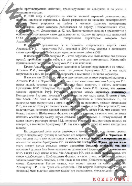 «12 мая примерно в 9 часов я вместе с Рауфом Арашуковым в сопровождении трех автомобилей охраны выехал из Хабезского района КЧР в Черкесск…Находясь в Черкесске, мы заехали в ОПФР по КЧР и находились там два часа. Выйдя из здания Пенсионного фонда, Арашуков сам сел в свой автомобиль «Тойота Ленд Крузер 200» черного цвета и куда-то уехал, попросив нас оставаться у ОПФР. Через 2 часа он позвонил мне на мобильный, и попросил подъехать к Драмтеатру, который располагается на улице Международная. Когда я с сопровождением подъехал к театру, Арашуков присоединился к нам и мы все поехали в Хабезский район. Подъехав к зданию администрации, Арашуков выбежал из своего автомобиля и побежал к себе в кабинет. Увидев его встревоженное состояние, я подумал, что с ним что-то произошло, в связи с чем побежал следом. Когда Арашуков забежал в кабинет, я зашел следом и увидел, что он умывается в своей комнате отдыха, при этом находясь в очень нервном состоянии. Я стал расспрашивать Арашукова о том, что произошло, и он сказал мне, что Фраля Шебзухова убили… После этого я вышел из кабинета и поехал домой. Я решил больше не выходить на работу к Арашукову», — говорится в показаниях Чукова, копия которых прилагается.
