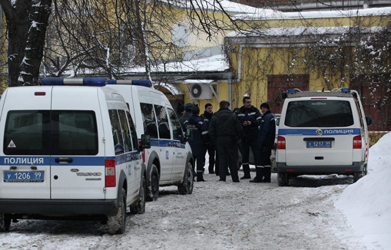 Машины полиции на Поварской улице в центре Москвы, где был ранен в результате стрельбы криминальный авторитет Аслан Усоян (Дед Хасан). После ранения он был доставлен в медучреждение, где скончался