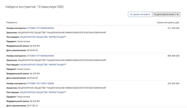 Причем она выигрывает тендеры почти всегда без конкурса. Из 375 контрактов фирмы за 2018 год только в 8 случаях была конкуренция. В остальных случаях, “Фармстандарт” был единственным участником, и с ним заключали контракт.