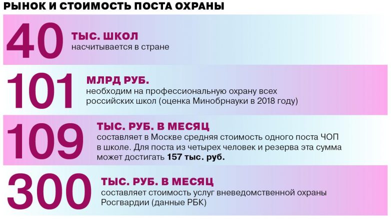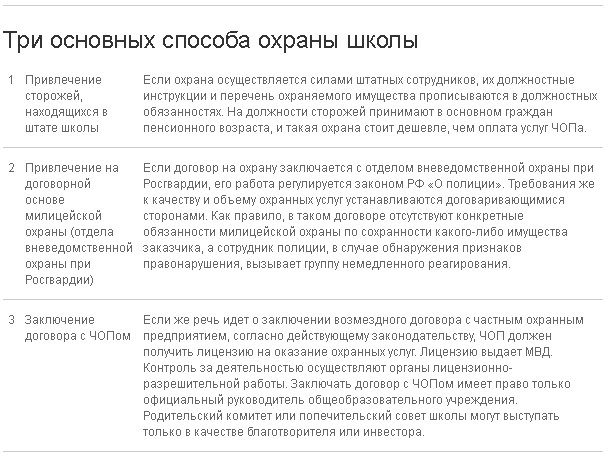 Как правило, договоры с частными охранными организациями имеют школы, расположенные в крупных городах-миллионниках регионов-доноров. Оставшиеся 80% за отсутствием бюджетного финансирования охраняются в лучшем случае вахтерами и сторожами, находящимися в штате самих образовательных организаций.