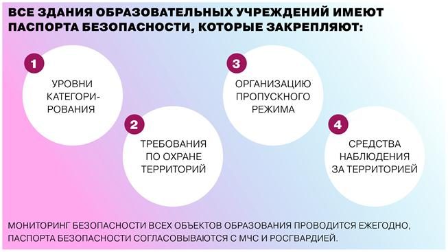 Говоря о безопасности образовательных объектов, отметим, что у всех зданий образовательных учреждений есть паспорта безопасности, закрепляющие широкий ряд мер, отдельные уровни категорирования, отдельные требования по охране территорий, организацию пропускного режима, средства наблюдения за территорией. На ежегодной основе проводится мониторинг комплексной безопасности всех объектов образования в стране. Паспорта в том числе согласовываются с территориальными представителями МЧС России и Росгвардии.
