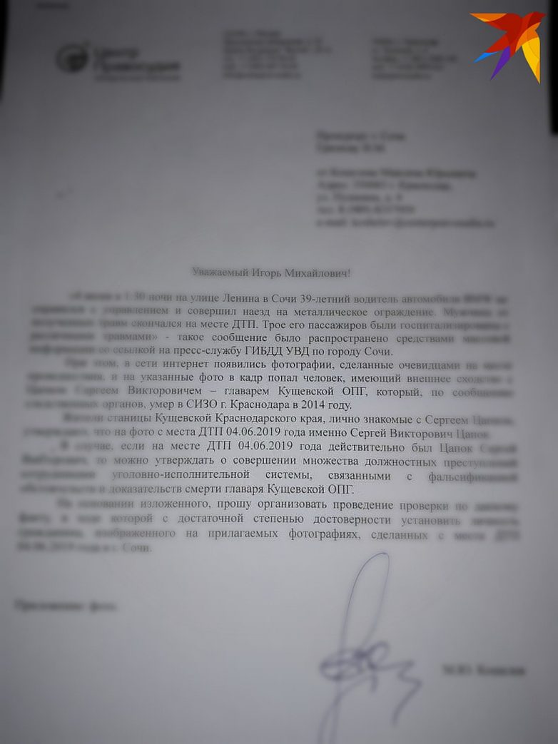 Обращение направлено прокурору Сочи— Уважаемый Игорь Михайлович, — пишут в обращении жители. — В сеть интернет попала фотография, на которой зафиксирован человек, имеющий внешнее сходство с лидером кущевского ОПГ Сергеем Цапком. Жители станицы Кущевской хорошо знали умершего главаря банды и утверждают, что на фото, сделанном 04.06.2019 года на месте происшествия именно Сергей Викторович Цапок. Если этот факт подтвердится, то можно будет утверждать о совершении целого ряда должностных преступлений. Просим провести проверку и установить достоверно личность человека, попавшего в кадр.