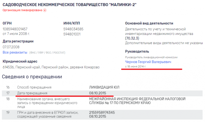 Подчеркнем, что с июня 2014 года лично Георгий Чернов выступал в статусе руководителя ликвидационной комиссии по двум СНТ «Малинки» и успешно ликвидировал оба юридических лица в октябре 2015 года.