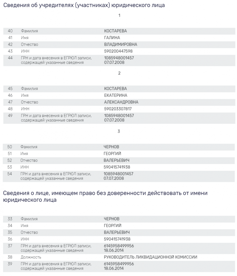 К слову, мы обратили внимание на тот факт, что лицом, имеющим право действовать без доверенности от имени юридического лица, являлся Георгий Чернов. А компанию в учреждении двух СНТ ему составили Галина и Екатерина Костаревы.