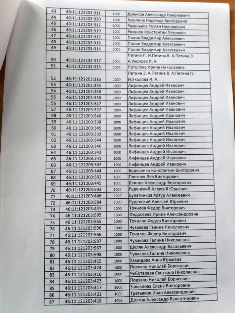 Вот первый лист. Обращаем внимание на номера 5, 7, 9, 11, 53-66, 94, 105, 114, 115. Там указано, что владельцем обширных угодий является Лифенцев Андрей Иванович. Это не кто иной, как депутат Курского городского собрания. Человек, которого органы МВД и ФСБ обоснованно связывают с миром криминала. Степень устойчивости этой связи пока неясна. Однако ее наличие четко прослеживается исходя из пункта 105, который ясно показывает совместное владение участком под кадастровым номером 46:11:121203:2038 в числе прочих хозяев гражданами Волобуевым Дмитрием Васильевичем (арестованный лидер ОПС), Лифенцевым Андреем Ивановичем и Полиным Владимиром Алексеевичем (родственник одного из бывших заместителей губернатора области).