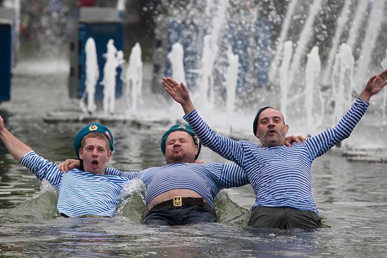 Бывшие десантники не только сами ныряли в фонтаны в тельняшках и беретах, но и нарядили в форму своих подруг, сыновей, дочерей и даже собак. А в Екатеринбурге в огромной тельняшке красовался и Илья Муромец на коне.
