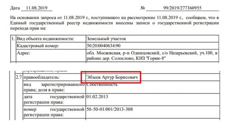 Этой сделке предшествовала покупка земельного участка с домом на Рублевке, приблизительной стоимостью порядка 200 млн рублей. В обоих случаях все договора были оформлены на Артура Эбзеева.