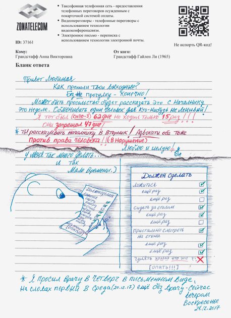 В марте Солнцевский суд Москвы освободил Грандстаффа из-под стражи, а его дело вернули прокурору для устранения грубейших нарушений, которые не позволили вынести приговор. Защита американца требует прекратить уголовное дело, но он пока еще находится в руках российского правосудия. Гейлен не знает, чем закончится его история, — сейчас он дома с женой, лечит полученные в СИЗО травмы и пишет книгу о своих злоключениях. Некоторыми тюремными историями и рисунками из будущей книги Грандстафф поделился с «Лентой.ру». Орфография и пунктуация автора.