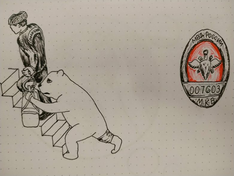 Мой первый опыт нахождения в «Матросской Тишине» длился пять недель и оказался очень неприятным. Камеры были грязные, в ужасном состоянии. Медицинский персонал не мог общаться на английском языке и отказался предоставить переводчика. Я часто осознавал, что меня неправильно поняли, но не мог достаточно хорошо общаться на русском, и у них не было ни терпения, ни сочувствия, чтобы понять мое состояние и нужды. Но самое яркое воспоминание — это дым. В моей камере в cizo 3 никто не курил, здесь же приходилось постоянно находиться в сигаретном дыму и пользоваться ингалятором. На этом рисунке — «медведь с астмой». Я застрял в камере, в дыму, кашляю и задыхаюсь. Со стен слезает краска: так и было, каждый раз, когда я просыпался, я находил куски краски на одежде и в волосах. Я пытался отмыть камеру, но это было нелегко. Как бы я потом ни ненавидел мысль о том, что придется вернуться в «матросску», мне приходилось это делать, если требовалась медицинская помощь.