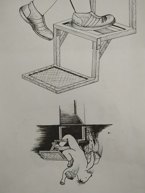 Здесь изображена сцена, когда полиция тащит меня вверх по лестнице за наручники. Они проигнорировали мои жалобы на боль в колене и не позволили мне медленно подниматься или спускаться по лестнице. Они просто сильнее тянули за наручники. Значок, который я нарисовал, принадлежит тащившему меня сотруднику. Я старался запомнить номер значка каждого. Ведь это был единственный способ определить, кто виновен в плохом обращении со мной. Но усилия оказались тщетными — моя жена получила письмо, в котором указывалось, что жалобам не хватает доказательств.