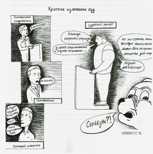Я узнал, что некоторые СМИ заинтересовались карикатурами, которые я рисовал, и что моя жена делится рисунками с ними. Я пытался упрощенным способом показать нелепую природу моего ареста. Надеялся, что люди начнут задавать вопросы, чтобы суд понял, что все не проходит тайно. Каждый свидетель обвинения давал один и тот же ответ на множество вопросов. Ответ был: «Я не помню». Когда одного из таможенных агентов спросили, что он увидел в коробке с моим заказом, он ответил: «Мне показалось, что там оружие». Может, он думал, что дает показания на другом процессе. Одна из почтовых служащих заявила, что не давала показания, которые обвинение представило в качестве доказательства. Показания были даны кем-то другим через пять месяцев после моего ареста, и ей сказали подписать их. Но самым смешным был эксперт — тренер по пауэрлифтингу. Обвинение использовало его, чтобы подтвердить, что я якобы использовал запрещённые препараты для спорта. В обвинительном заключении они указали, что я выгляжу слишком хорошо для своего возраста, у меня слишком много энергии, поэтому я, должно быть, употребляю запрещённые вещества. Этот свидетель был огромным, почти мультяшным. У него не было видно шеи, и его руки были больше, чем мои ноги. Тем не менее, когда его спросили, принимал ли он когда-либо запрещённые препараты для спорта, он ответил: «Нет, только аминокислоты». Я даже засмеялся.