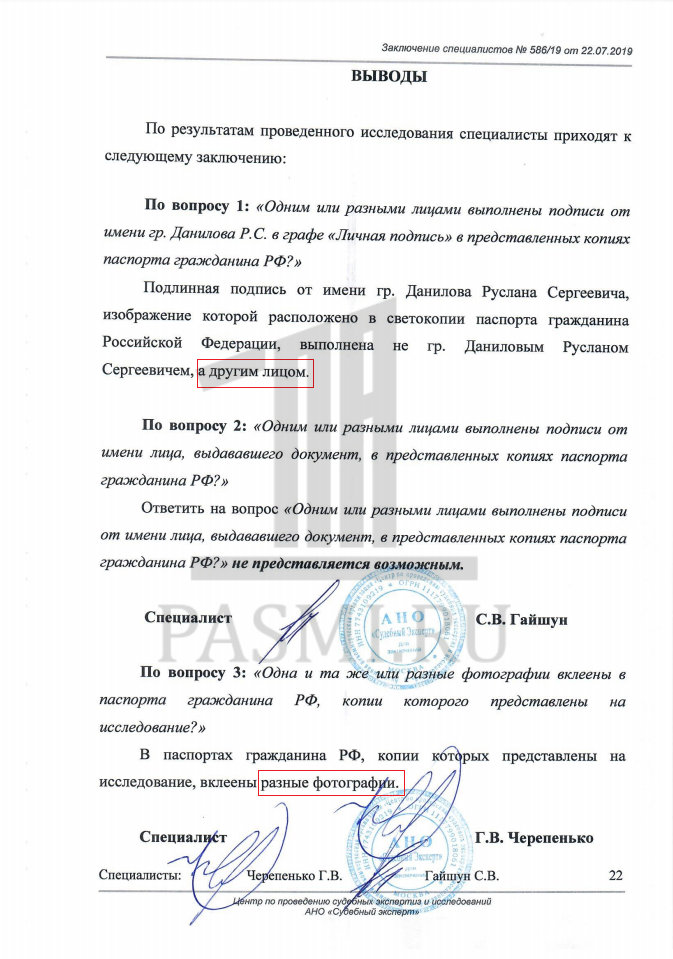 Этот факт подтверждается заключением специалистов, сделанным по результатам комплексного портретного исследования. Эксперты установили, что подписи от имени Данилова в паспортах выполнены разными лицами, кроме того, в документы вклеены разные фотографии владельца.