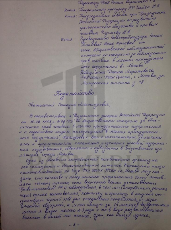 Письмо с анализом системы питания заключенных и цен на продукты Денис Набиуллин составил в феврале 2019 года, когда еще находился в изоляторе. Обращения были направлены действующему на тот момент директору ФСИН России Геннадию Корниенко, генеральному прокурору РФ Юрию Чайке, председателю совета при президенте по правам человека Михаилу Федотову и руководителю Роспотребнадзора Анне Поповой. Однако, как пояснил ПАСМИ адвокат Набиуллина, на это письмо не ответил ни один из адресатов.
