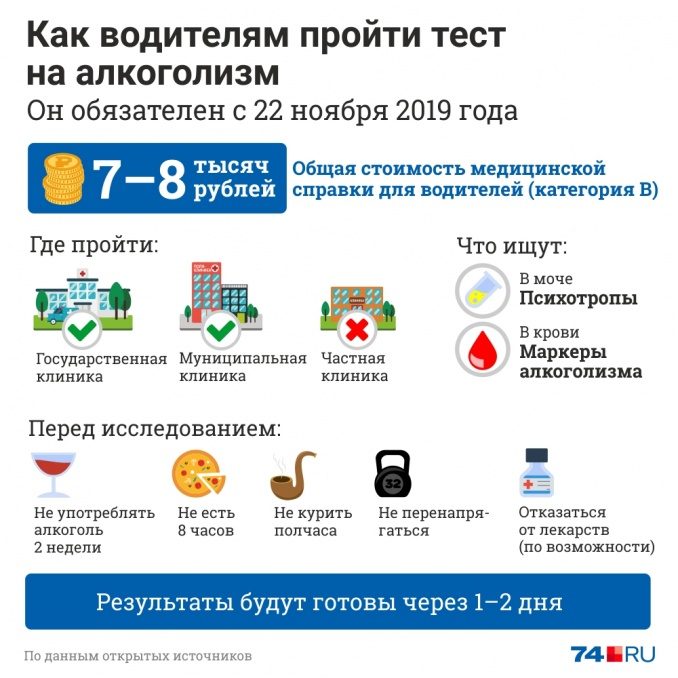 До сих пор водительский медосмотр обходился в 1500–3000 рублей в зависимости от медцентра и категории прав. Процедура была формальна: осмотр психиатра состоял из строгого взгляда да пары вопросов и занимал минуту. Нарколог обычно лишь проверял, не состоит ли человек на учёте в наркодиспансере.Как стало: докажи, что ты не алкоголик