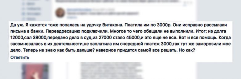 Десятки «антикредитных» организаций предлагают помощь: «Возьмём коллекторов на себя, заморозим долг, снизим размер платежей, всё будет хорошо». Но на деле они берут с людей деньги не за реальную помощь, а за пустые обещания.Дмитрий из Тюмени в 2018 году обратился в компанию «Витакон», потому что платить по кредитам ему стало сложно. Фирма пообещала, что решит проблему с кредитами от четырёх до 12 месяцев, избавит мужчину от коллекторских звонков и поможет снизить начисленную за просрочку сумму. В течение года «Витакон» брал с Дмитрия ежемесячную плату, но даже не сообщил ему, что банк подал на него в суд за просрочку платежей. Общаться с сотрудниками «Витакона» лично Дмитрий не мог, поскольку менеджеры и юристы компании находятся в Челябинске. По телефону они утверждали, что именно благодаря их действиям банк пошёл в суд.