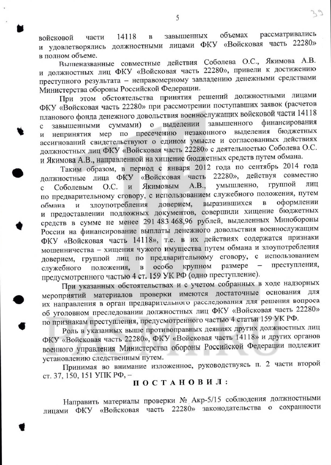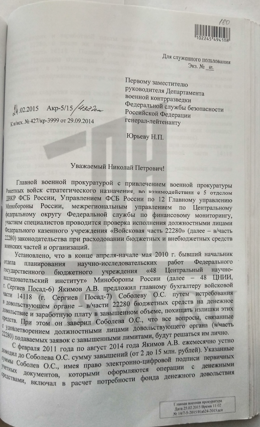 Между тем, в материалах проверки, подписанных первым замом Главного военного прокурора Андреем Никулищиным (он покинул этот пост 2017 году) указано, что именно согласованные действия сотрудников в/ч 14 118 и Центра финансирования привели к неправомерному завладению денежными средствами Минобороны. Кроме того, Никулищин указывал на признаки причастности чиновников из Центра к хищениям через 48-й Центральный научно-исследовательский институт Министерства обороны (48 ЦНИИ), которые происходили с 2008 по 2011 годы, то есть еще до момента подключения к преступной схеме ядерной в/ч.