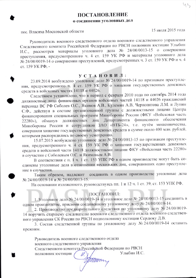 Именно на основе этих материалов прокурорской проверки в 2015 году и было возбуждено уголовное дело против сотрудников Центра финансирования. Расследование было поручено военному управлению СКР, а оперативное сопровождение дела осуществлял Департамент военной контрразведки ФСБ.