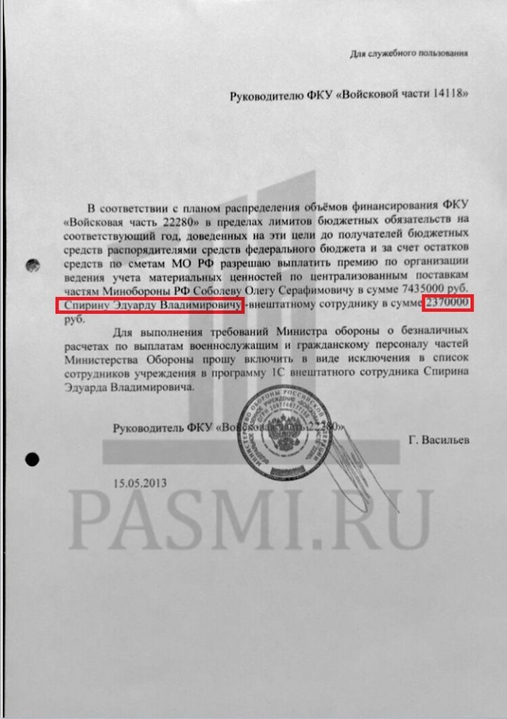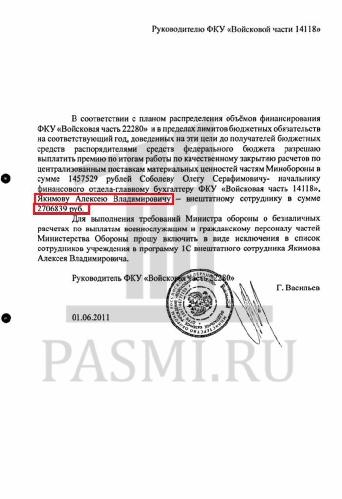 Например, в сентябре 2011 года Васильев просит руководителя в/ч 14118 «включить в виде исключения в список сотрудников учреждения в программу 1 С внештатного сотрудника Якимова Алексея Владимировича» и начислить ему за качественно выполненную работу более 2,7 млн рублей.