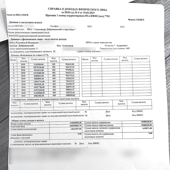 (Любовь показывает две справки 2-НДФЛ Александра Добровинского за 2018 год.)