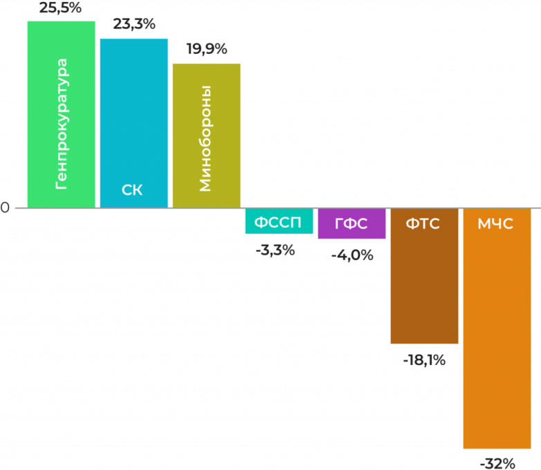 С начала третьего срока президентства Владимира Путина больше всего выросло количество прокуроров и следователей — на 25% и 23% соответственно. Также на 19% вырос штат Минобороны. При этом произошло значительное сокращение сотрудников МВД (на 14% по сравнению с 2015 годом), но оно связано с созданием Росгвардии в апреле 2016 года и переводом в новую структуру почти всех бойцов из ОМОНа, СОБРа и аналогичных отрядов. Также потеряли в численности спасатели: в МЧС стало служить на 32% меньше персонала, чем в 2012 году — это связано с оптимизацией штата.