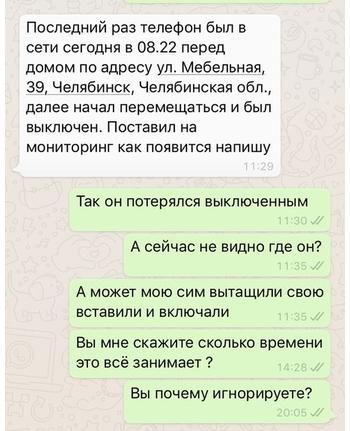 В такой ситуации оказалась Жанна из Челябинска. Она потеряла свой телефон, обратилась к «специалисту» по поиску гаджетов через IMEI-код. «Специалист» сказал, что найдёт устройство с помощью сканирования, услугу оценил в 580 рублей, а потом сообщил, что телефон выключен, как снова появится в сети — Жанну оповестят. На все дальнейшие сообщения молодой человек не отвечал, деньги не вернул, хотя обещал это сделать.