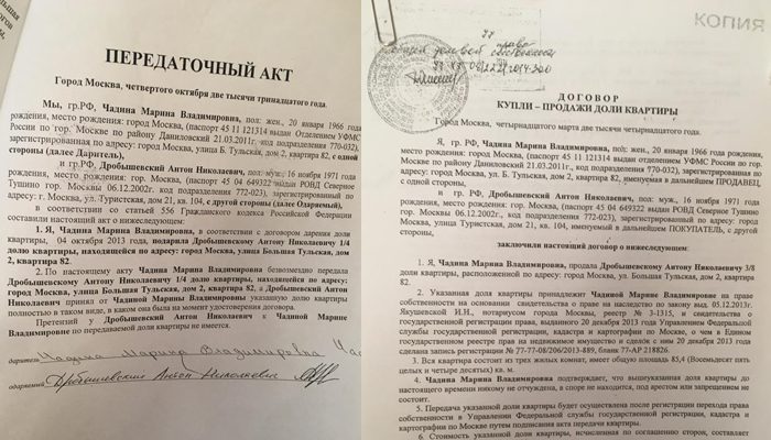 «Я открыл секретер, нашёл два договора об отчуждении долей квартиры, — продолжает Вячеслав Киселёв. — Первый договор дарения, где было написано, что моя жена подарила незнакомому нашей семье человеку 1/4 долю и второй договор — рядом лежал — по купле-продажи 3/8 долей квартиры этому же человеку. Я в шоке был в тот день, когда я нашёл эти договоры».