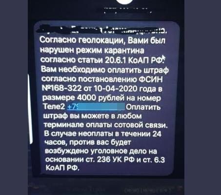 Одно из последних мошенничеств зафиксировала компания Group-IB, занимающаяся детектированием и предотвращением кибератак. На тысячи телефонов начали приходить однотипные СМС-уведомления с требованием в течение суток оплатить штраф за нарушение режима самоизоляции. В случае отказа платить мошенники угрожают уголовным преследованием.
