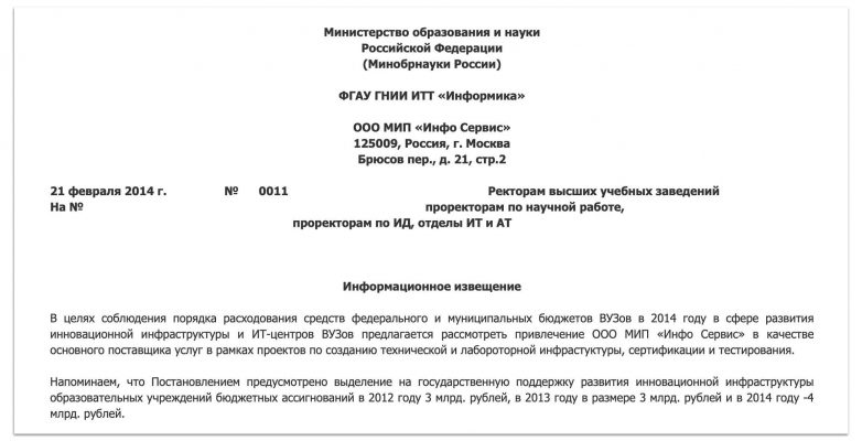 Письмо от компании «Информика-сервис» в вузыВ тексте также указывалось, что на развитие инновационной инфраструктуры бюджетным учреждениям в 2012–2013 годах выделено по три миллиарда рублей, а в 2014-м — четыре миллиарда. Письмо рассылалось с «шапкой» министерства и ГНИИ «Информика». Почему государственная компания «Информика» и Минобрнауки лоббируют интересы «Информика-сервис», представители организаций не объясняли.