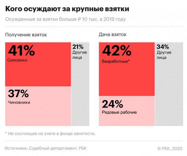 В 2019 году количество приговоров, вынесенных совокупно по статьям о даче и получении крупных взяток (2842), существенно превысило число приговоров за мелкое взяточничество (1884). В предыдущем году соотношение было обратное: 2451 осужденный за существенные суммы против 2749 осужденных за взятки в пределах 10 тыс. руб.