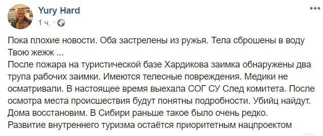 — Сожгли всё полностью. Все домики отдельно стоящие. Шли и поочерёдно всё жгли. Само сгореть не могло. Пропали два егеря. Народ звереет, что ли? Что будет дальше? — огорошил утром своих подписчиков в «Фейсбуке» владелец заимки Юрий Хардиков.