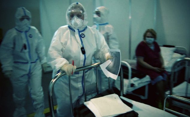 Медики временного госпиталя в «Ленэкспо» в защитных костюмах от Jiajia Holding Group. Скриншоты из видео, размещенного на сайте больницы