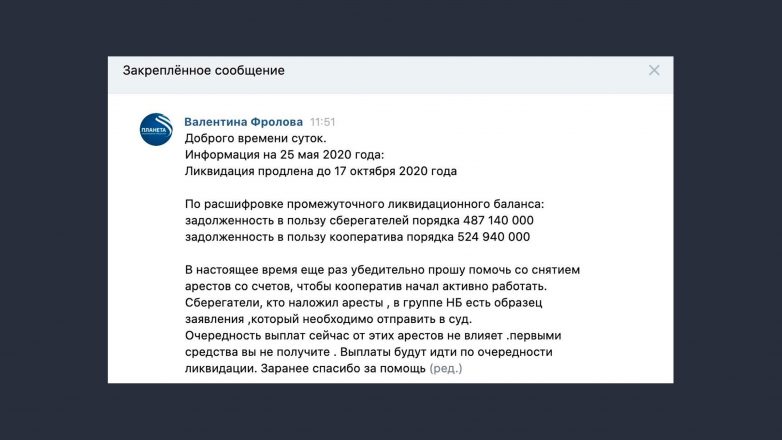 Некоторые пайщики требовали вернуть им деньги, подали иски в суд, поэтому счета кооператива находятся под арестом, который наложен в связи с заявлениями сберегателей. Теперь Валентина Фролова из АО «Планета» и Ольга Рюмина убеждают этих вкладчиков забрать свои заявления, чтобы аресты со счетов были сняты, якобы тогда кооператив сможет работать снова и вернуть всем деньги.
