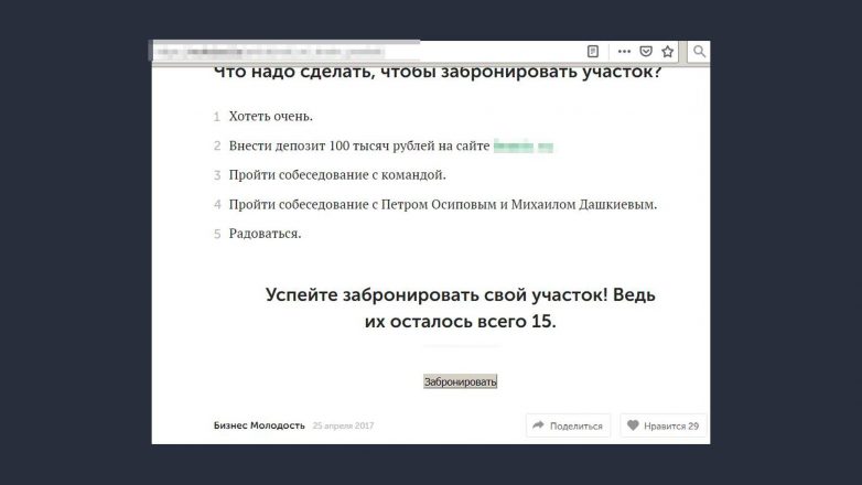 ООО «Бизнес-ресурс» — владелец бренда «Реки», так называется «концептуальный посёлок для своих», который Осипов и Дашкиев начали рекламировать ещё в 2017 году. Второе название посёлка — БМ Village. Желающим записаться на просмотр участка рядом с деревней Юрьево Мытищинского района приходится вносить предоплату в сумме 100 тысяч рублей. И по договору оферты при отказе от сделки задаток не возвращается.