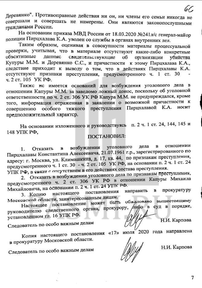 В июне после жалоб Константина Пирцхалава материал проверки о подготовке покушения на Деревянко и Капуру был выделен в отдельное производство. А 17 июля тот же следователь Карпова вынесла постановление об отказе в возбуждении уголовного дела в отношении генерала за отсутствием состава преступления.
