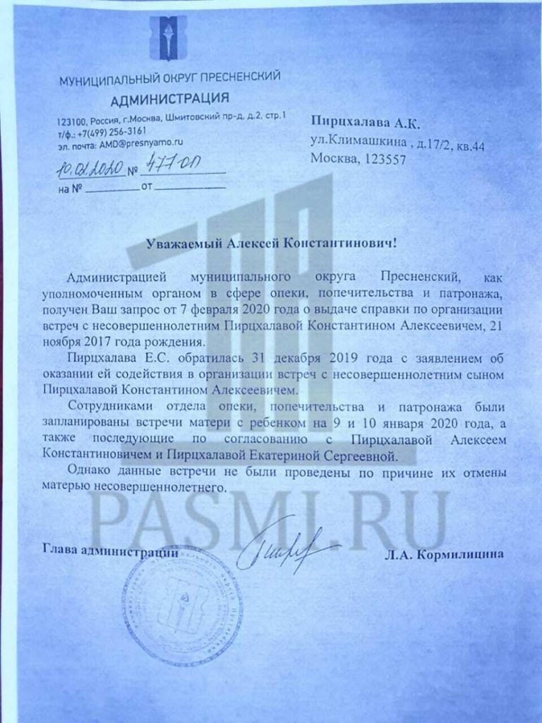 Кроме того, по данным администрации, Екатерина Пирцхалава неоднократно игнорировала организованные органом опеки встречи с ребенком.