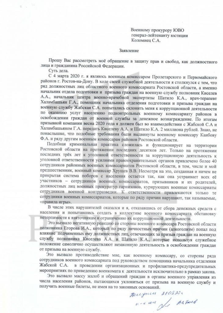 В сентябре 2020 года я отправлял обращение военному прокурору Южного военного округа генерал-лейтенанту юстиции Сергею Коломийцу о коррупционной деятельности должностных лиц военного комиссариата Ростовской области Алексея Киселева и Константина Шатило и непринятия к ним мер со стороны военной прокуратуры гарнизона Ростов-на-Дону. Никаких основания для мер реагирования там также не нашли.