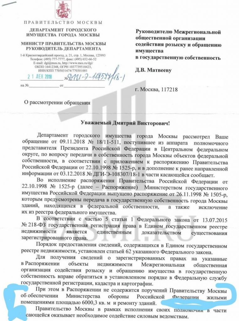 «В Департаменте жилищного обеспечения Министерства обороны Российской Федерации отсутствуют сведения о выделении Минобороны России правительством города Москвы в соответствии с Распоряжением 6 000,3 кв. метров жилой площади», — говорится в ответе Минобороны на запрос “Госрозыска”.